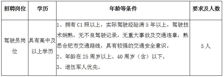 現(xiàn)因2019年度合肥市市場監(jiān)督管理局根據(jù)工作需要和合肥市市場監(jiān)督管理局政府購買駕駛員崗位服務(wù)控制數(shù)空缺情況,面向社會公開招聘政府購買駕駛員崗位工作人員5名。
