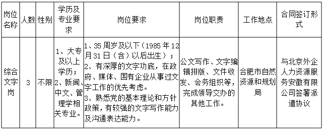 因工作需要,合肥市自然資源和規(guī)劃局招聘政府購(gòu)買崗位服務(wù)人員3名。具體如下 :