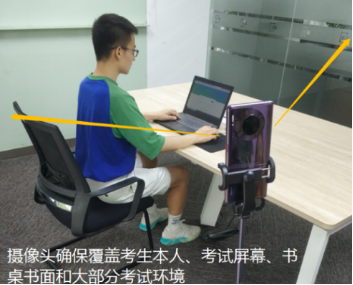 ③攝像頭:考試時手機(jī)放置在后方45度角斜位置,保證畫面清晰完整,畫面中必須包含考試用機(jī)的屏幕、桌面、考生側(cè)影;
