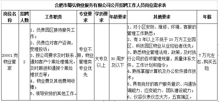蜀弘物業(yè)公司秉承“標(biāo)準(zhǔn)化運(yùn)營(yíng)、專業(yè)化服務(wù)、智能化管理、規(guī)?;l(fā)展”的經(jīng)營(yíng)理念,探索“物業(yè)服務(wù)+企業(yè)服務(wù)+屬地服務(wù)”的服務(wù)模式,從業(yè)主需求出發(fā),堅(jiān)持服務(wù)初心,樹(shù)立優(yōu)秀物業(yè)服務(wù)品牌。因工作需要,現(xiàn)面向社會(huì)公開(kāi)招聘2名物業(yè)管家。具體如下: